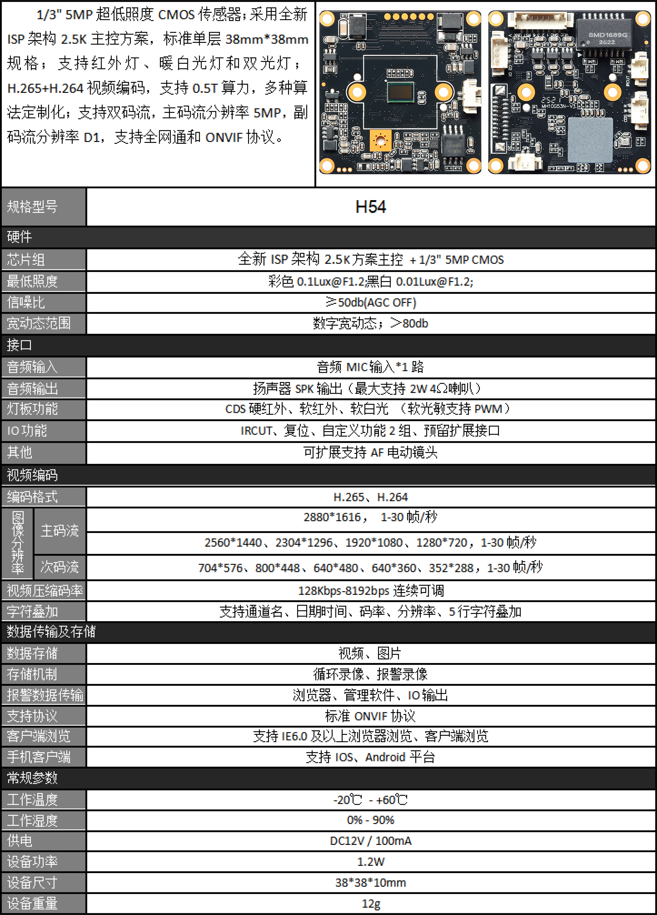مشخصات برد: 1/3" ultra-low light CMOS sensor; adopts a new ISP architecture 2.5K main control Hisilicon solution, single board, size: 38mm×38mm